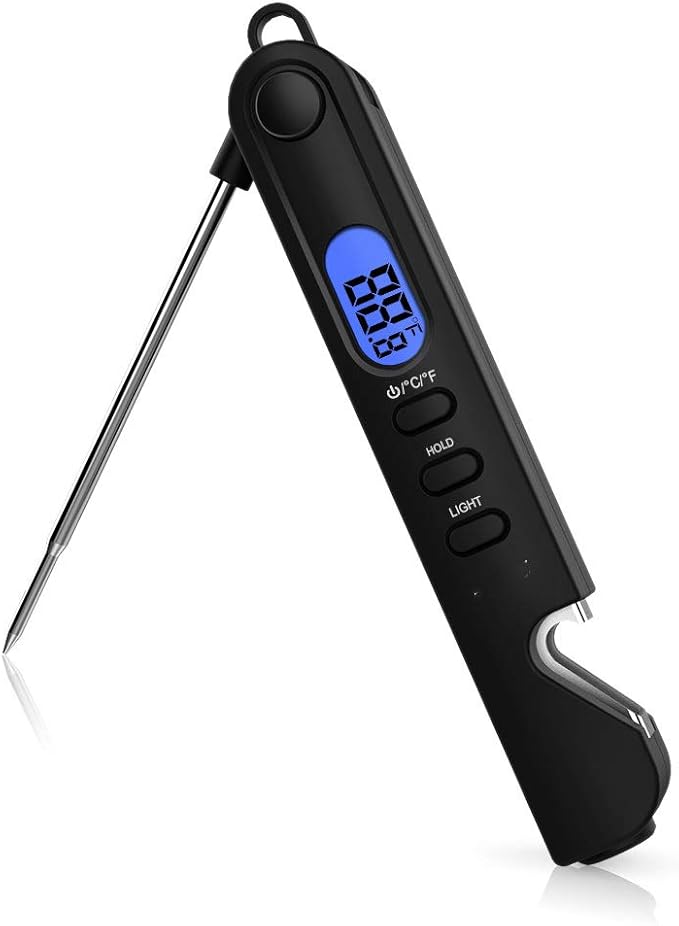 - 1 Details: Multipurpose Instant Read Digital Meat Thermometer with Stainless Steel Folding Probe, Backlight and Bottle Opener, Best Waterproof, Easy to use, Magnet, Hook. for Outdoor Grill, Cooking and BBQ.